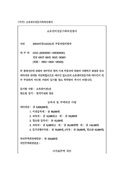 주요내용 : 경매 등 법원의 결정에 따라부동산의 소유권이 낙찰자에 이전하기 위한 목적으로 사용되어지는 신청서 양식임. 단 무단전재 방지목적으로 PDF 파일로 올리니, 구매하신 후 혹 원본 파일이 필요하신 분들은 톡이나 문자, 메일, 전화 등을 주시면 작성방법 등에 대한 간단한 무료상담과 함께 원본 파일을 보내드리도록 하겠습니다.