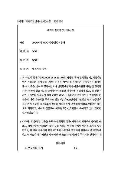 주요내용 : 매각기일 통지, 불가분 일체인 토지와 지상 건물을 동시에 경매하기 위한 목적으로 매각기일 변경 및 연기신청시 사용되어지는 신청서 양식임. 단 무단전재 방지목적으로 PDF 파일로 올리니, 구매하신 후 혹 원본 파일이 필요하신 분들은 톡이나 문자, 메일, 전화 등을 주시면 작성방법 등에 대한 간단한 무료상담과 함께 원본 파일을 보내드리도록 하겠습니다.