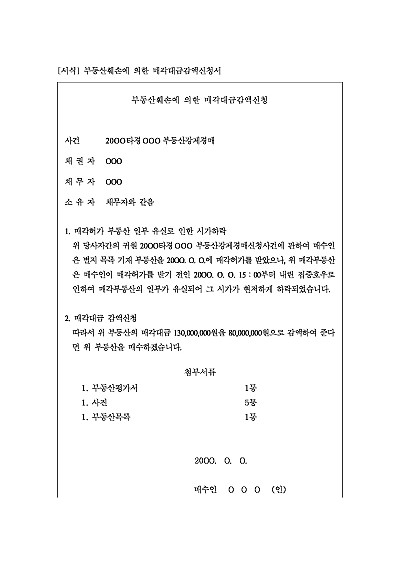 주요내용 : 매각허가 부동산, 훼손 등으로 인한 시가하락시 매각 대금의 감액을 구하기 위하여 사용되어지는 신청서 양식임. 단 무단전재 방지목적으로 PDF 파일로 올리니, 구매하신 후 혹 원본 파일이 필요하신 분들은 톡이나 문자, 메일, 전화 등을 주시면 작성방법 등에 대한 간단한 무료상담과 함께 원본 파일을 보내드리도록 하겠습니다.
