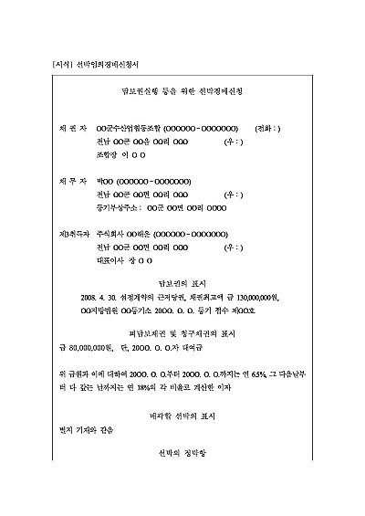 주요내용 : 담보권 실행을 위해 담보로 제공된 선박에 대한 임의경매신청시 사용되어지는 신청서 양식임. 단 무단전재 방지목적으로 PDF 파일로 올리니, 구매하신 후 혹 원본 파일이 필요하신 분들은 톡이나 문자, 메일, 전화 등을 주시면 작성방법 등에 대한 간단한 무료상담과 함께 원본 파일을 보내드리도록 하겠습니다.