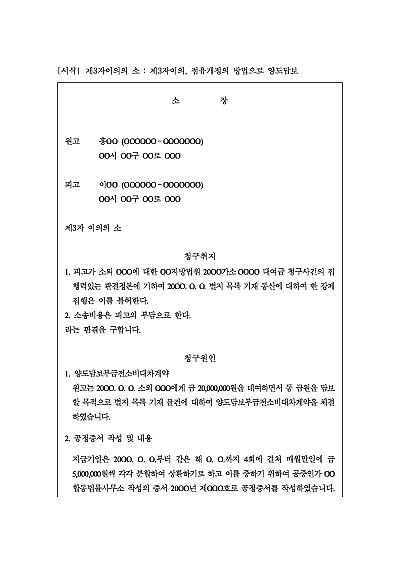 주요내용 : 원고 소유의 양도담보물(점유개정에 의한 양도)에 대한 강제집행신청, 정당한 소유자로서 당해 강제집행의 불허를 구하기 위한 목적으로 사용되어지는 소장 양식임. 단 무단전재 방지목적으로 PDF 파일로 올리니, 구매하신 후 혹 원본 파일이 필요하신 분들은 톡이나 문자, 메일, 전화 등을 주시면 작성방법 등에 대한 간단한 무료상담과 함께 원본 파일을 보내드리도록 하겠습니다.