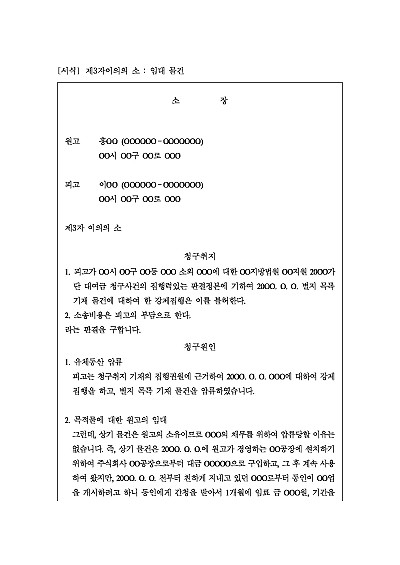 주요내용 : 원과 임대한 물건에 대한 압류집행, 청구이의의 소 제기, 당해 물건에 대한 강제집행의 불허를 구하기 위한 목적으로 사용되어지는 소장 양식임. 단 무단전재 방지목적으로 PDF 파일로 올리니구매하신 후 혹 원본 파일이 필요하신 분들은 톡이나 문자메일전화 등을 주시면 작성방법 등에 대한 간단한 무료상담과 함께 원본 파일을 보내드리도록 하겠습니다.