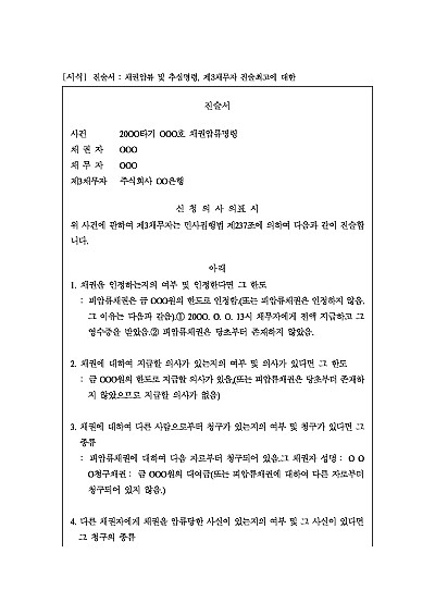주요내용 : 제3채무자 진술최고 명령 후 당해 명령에 대한 진술시 사용되어지는 양식임. 단 무단전재 방지목적으로 PDF 파일로 올리니구매하신 후 혹 원본 파일이 필요하신 분들은 톡이나 문자메일전화 등을 주시면 작성방법 등에 대한 간단한 무료상담과 함께 원본 파일을 보내드리도록 하겠습니다.