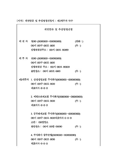 주요내용 : 채권자가 법원의 결정(명령)을 통해 채무자가 제3자에게 받을 채권(예금, 급여, 매출채권 등)을 압류하고, 이를 직접 추심(대신 받아내는)하기 위한 목적으로 사용되어지는 신청서 양식임. 단 무단전재 방지목적으로 PDF 파일로 올리니, 구매하신 후 혹 원본 파일이 필요하신 분들은 톡이나 문자, 메일, 전화 등을 주시면 작성방법 등에 대한 간단한 무료상담과 함께 원본 파일을 보내드리도록 하겠습니다.