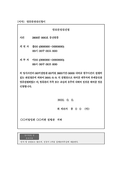 주요내용 : 유체동산을 압류집행 후, 압류물의 부족 또는 손상의 유무에 대하여 점검을 하여줄 것을 신청할 때 사용되어지는 양식임. 단 무단전재 방지목적으로 PDF 파일로 올리니, 구매하신 후 혹 원본 파일이 필요하신 분들은 톡이나 문자, 메일, 전화 등을 주시면 작성방법 등에 대한 간단한 무료상담과 함께 원본 파일을 보내드리도록 하겠습니다.