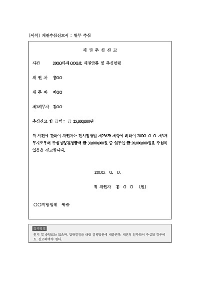 주요내용 : 채권자가 채권을 변제받았을 때 법원에 이를 공식적으로 알리는 문서로서 채권자가 추심한 금액을 공탁해야 하는 경우도 있으므로, 채권 추심이 완료된 후 신속하게 그 신고를 하기 위한 목적으로 사용되어지는 신청서 양식임. 단 무단전재 방지목적으로 PDF 파일로 올리니, 구매하신 후 혹 원본 파일이 필요하신 분들은 톡이나 문자, 메일, 전화 등을 주시면 작성방법 등에 대한 간단한 무료상담과 함께 원본 파일을 보내드리도록 하겠습니다.