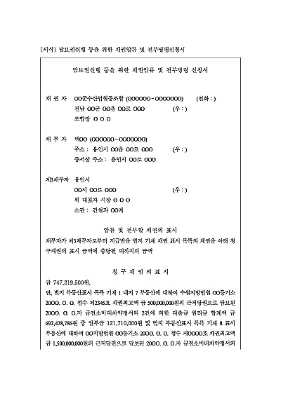 주요내용 : 담보권 실행을 위한 채권압류 및 전부명령 신청은 집행력 있는 권원(판결정본 등)을 바탕으로, 채무자의 제3채무자에 대한 채권을 압류하고 이를 신청인에게 이전시키기 위한 목적으로 사용되어지는 신청서 양식임. 단 무단전재 방지목적으로 PDF 파일로 올리니, 구매하신 후 혹 원본 파일이 필요하신 분들은 톡이나 문자, 메일, 전화 등을 주시면 작성방법 등에 대한 간단한 무료상담과 함께 원본 파일을 보내드리도록 하겠습니다.