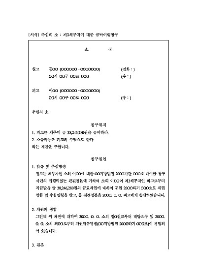 주요내용 : 채권압류 및 추심명령을 받았음에도 제3채무자가 채권을 지급하지 않을 경우, 압류채권자는 민사집행법 제249조에 따라 제3채무자를 상대로 별도의 소송을 제기하여 지급을 강제하기 위한 목적으로 사용되어지는 소장 양식임. 단 무단전재 방지목적으로 PDF 파일로 올리니, 구매하신 후 혹 원본 파일이 필요하신 분들은 톡이나 문자, 메일, 전화 등을 주시면 작성방법 등에 대한 간단한 무료상담과 함께 원본 파일을 보내드리도록 하겠습니다.