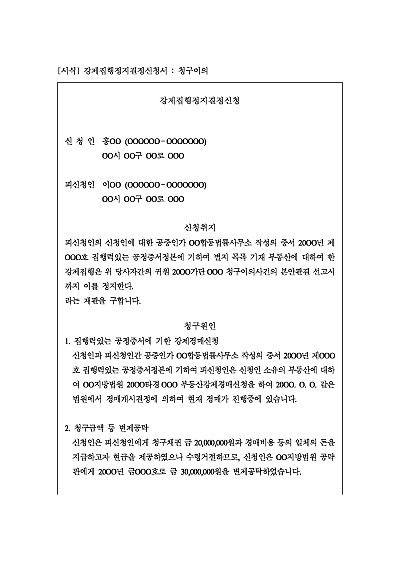 주요내용 : 공정증서에 기한 경매신청, 채권 및 경매비용 등 공탁, 원인채권 소멸, 청구이의의 소 제기, 본안판결 선고시까지 당해 경매절차의 정지를 구할 목적으로 사용되어지는 신청서 양식임. 단 무단전재 방지목적으로 PDF 파일로 올리니, 구매하신 후 혹 원본 파일이 필요하신 분들은 톡이나 문자, 메일, 전화 등을 주시면 작성방법 등에 대한 간단한 무료상담과 함께 원본 파일을 보내드리도록 하겠습니다.