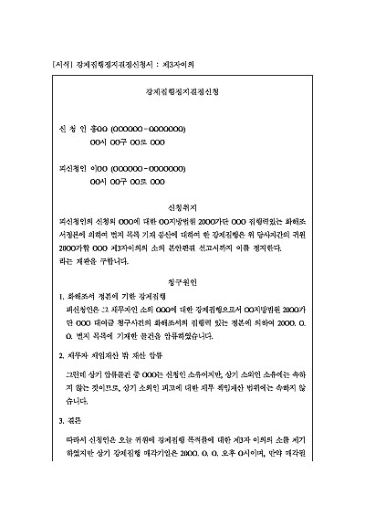 주요내용 : 채무자의 책임재산 밖 재산 압류, 매각절차가 진행될 경우 실소유자의 재산권 현저한 침해, 제3자 이의의 소 제기, 본안판결 선고시까지 강제집행절차 정지를 구하기 위한 목적을로 사용되어지는 신청서 양식임. 단 무단전재 방지목적으로 PDF 파일로 올리니, 구매하신 후 혹 원본 파일이 필요하신 분들은 톡이나 문자, 메일, 전화 등을 주시면 작성방법 등에 대한 간단한 무료상담과 함께 원본 파일을 보내드리도록 하겠습니다.