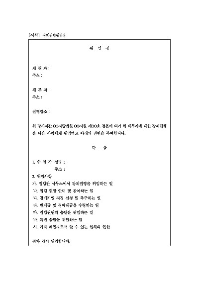 주요내용 : 강제집행절차를 제3자에게 위임시 사용되어지는 양식임. 단 무단전재 방지목적으로 PDF 파일로 올리니, 구매하신 후 혹 원본 파일이 필요하신 분들은 톡이나 문자, 메일, 전화 등을 주시면 작성방법 등에 대한 간단한 무료상담과 함께 원본 파일을 보내드리도록 하겠습니다.