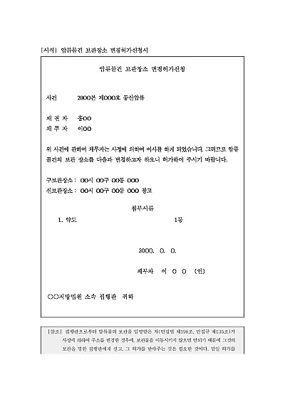 주요내용 : 압류집행 완료 후 채무자의 사정(이사 등)으로 인하여 압류물의 보관장소를 변경할 사정이 발생한 경우 당해 압류물건의 보관장소 이전을 목적으로 사용되어지는 신고서 양식임. 단 무단전재 방지목적으로 PDF 파일로 올리니, 구매하신 후 혹 원본 파일이 필요하신 분들은 톡이나 문자, 메일, 전화 등을 주시면 작성방법 등에 대한 간단한 무료상담과 함께 원본 파일을 보내드리도록 하겠습니다.