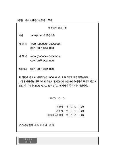 주요내용 :기 지정된 매각기일의 연기를 목적으로 사용되어지는 신청서 양식임. 단 무단전재 방지목적으로 PDF 파일로 올리니, 구매하신 후 혹 원본 파일이 필요하신 분들은 톡이나 문자, 메일, 전화 등을 주시면 작성방법 등에 대한 간단한 무료상담과 함께 원본 파일을 보내드리도록 하겠습니다.