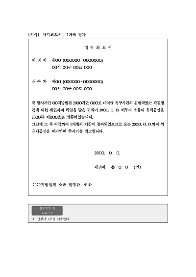 주요내용 : 압류집행, 압류 후 1개월 경과, 이를 이유로 당해 유체동산의 매각하여 줄 것을 최고할 때 사용되어지는 양식임. 단 무단전재 방지목적으로 PDF 파일로 올리니, 구매하신 후 혹 원본 파일이 필요하신 분들은 톡이나 문자, 메일, 전화 등을 주시면 작성방법 등에 대한 간단한 무료상담과 함께 원본 파일을 보내드리도록 하겠습니다.