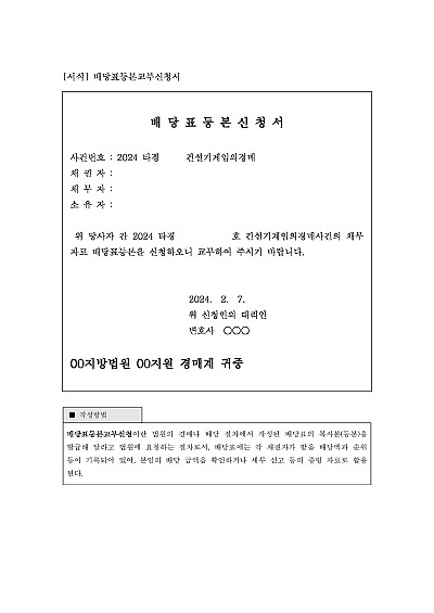 주요내용 : 법원의 경매나 배당 절차에서 작성된 배당표의 복사본(등본)을 발급해 달라고 법원에 요청하기 위한 목적으로 사용되어지는 신청서 양식임. 단 무단전재 방지 목적으로 PDF 파일로 올리니, 구매하신 후 혹 원본 파일이 필요하신 분들은 톡이나 문자, 메일, 전화 등을 주시면 작성 방법 등에 대한 간단한 무료 상담과 함께 원본 파일을 보내드리도록 하겠습니다.