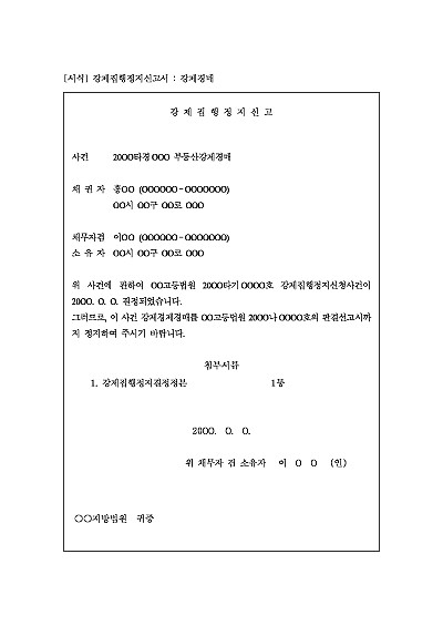 주요내용 : 강제집행정지결정, 그에 기초하여 강제경매를 고등법원 판결선고시까지 정지를 구할 목적으로 사용되어지는 신고서 양식임. 단 무단전재 방지목적으로 PDF 파일로 올리니, 구매하신 후 혹 원본 파일이 필요하신 분들은 톡이나 문자, 메일, 전화 등을 주시면 작성방법 등에 대한 간단한 무료상담과 함께 원본 파일을 보내드리도록 하겠습니다.