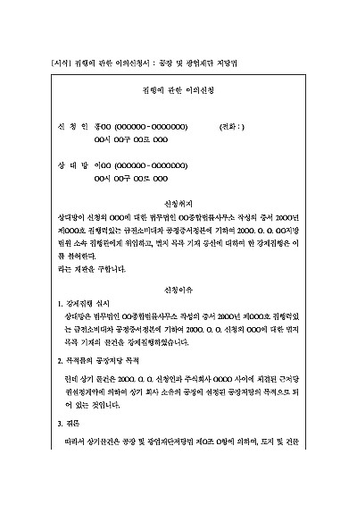주요내용 : 공장이나 광업재단에 대한 집행과정에서 법률적, 절차적 문제가 발생하였을 때 그 시정을 구할 목적으로 사용되어지는 신청서 양식임. 단 무단전재 방지목적으로 PDF 파일로 올리니, 구매하신 후 혹 원본 파일이 필요하신 분들은 톡이나 문자, 메일, 전화 등을 주시면 작성방법 등에 대한 간단한 무료상담과 함께 원본 파일을 보내드리도록 하겠습니다.