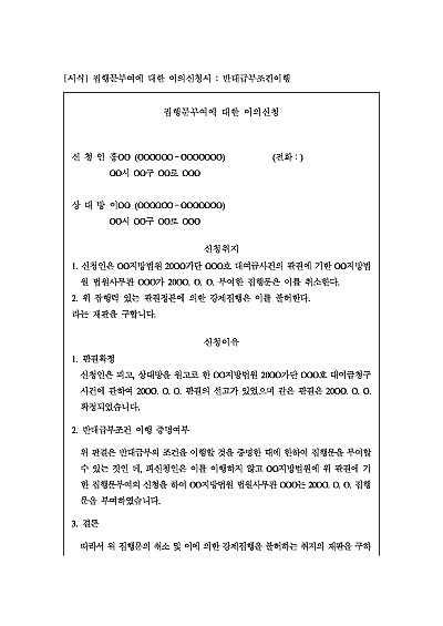 주요내용 :집행문 부여에 대한 이의신청서(반대급부조건이행)는 채무자가 채권자의 반대급부 이행과 같은 조건을 성취하지 않았는데도 법원이 집행문을 잘못 부여했을 때 집행문의 효력을 다투기 위해 제출하는 신청서 양식임. 단 무단전재 방지목적으로 PDF 파일로 올리니, 구매하신 후 혹 원본 파일이 필요하신 분들은 톡이나 문자, 메일, 전화 등을 주시면 작성방법 등에 대한 간단한 무료상담과 함께 원본 파일을 보내드리도록 하겠습니다.