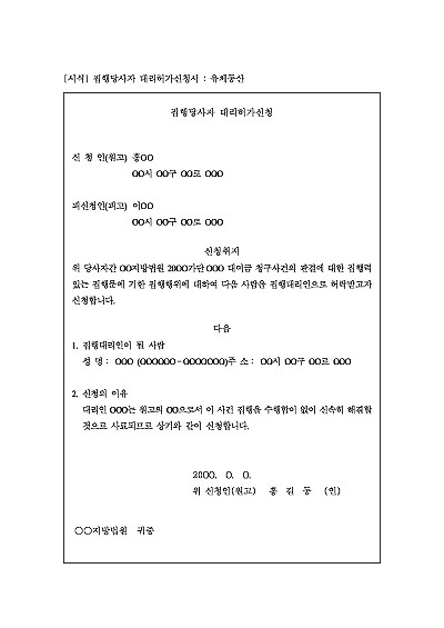 주요내용 : 집행력 있는 집행문에 기하여 강제집행 행위를 본인이 아닌 제3자가 대리집행하기 위한 목적으로 사용되어지는 신청서 양식임. 단 무단전재 방지목적으로 PDF 파일로 올리니, 구매하신 후 혹 원본 파일이 필요하신 분들은 톡이나 문자, 메일, 전화 등을 주시면 작성방법 등에 대한 간단한 무료상담과 함께 원본 파일을 보내드리도록 하겠습니다.