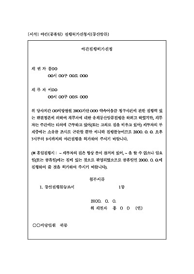 주요내용 : 집행력 있는 판결정본에 기한 압류집행이 채무자의 출근 등 부재로 인하여 그 집행이나 소유물 조사도 곤란할 경우 당해 집행불능을 해소할 목적으로 야간 또는 공휴일 집행을 허가받기 위한 목적으로 사용되어지는 신청서 양식임. 단 무단전재 방지목적으로 PDF 파일로 올리니, 구매하신 후 혹 원본 파일이 필요하신 분들은 톡이나 문자, 메일, 전화 등을 주시면 작성방법 등에 대한 간단한 무료상담과 함께 원본 파일을 보내드리도록 하겠습니다.