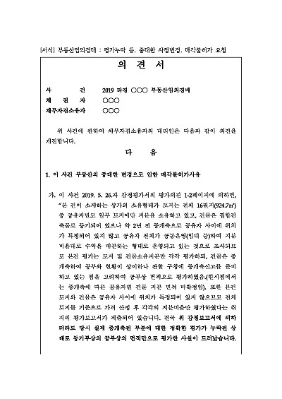주요내용 : 부동산 경매 절차 진행 중 이해관계인(채권자, 채무자, 임차인 등)이 법원에 경매 진행 상황에 대한 자신의 권리나 주장, 의견을 서면으로 제출하는 문서임. 단 무단전재 방지목적으로 PDF 파일로 올리니, 구매하신 후 혹 원본 파일이 필요하신 분들은 톡이나 문자, 메일, 전화 등을 주시면 작성방법 등에 대한 간단한 무료상담과 함께 원본 파일을 보내드리도록 하겠습니다.