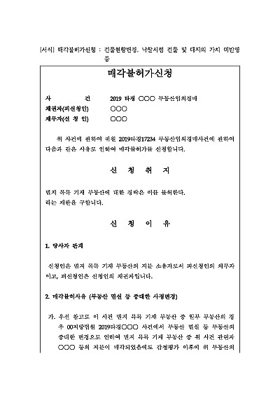 주요내용 : 경매 낙찰자가 대금 납부 전, 매각 물건 명세서상 중대한 오류(유치권 미기재, 선순위 권리 누락 등)나 목적물 훼손 등 정당한 사유가 있을 때 법원에 낙찰 취소를 요청하기 위한 목적으로 사용되어지는 신청서 양식임. 단 무단전재 방지목적으로 PDF 파일로 올리니, 구매하신 후 혹 원본 파일이 필요하신 분들은 톡이나 문자, 메일, 전화 등을 주시면 작성방법 등에 대한 간단한 무료상담과 함께 원본 파일을 보내드리도록 하겠습니다.