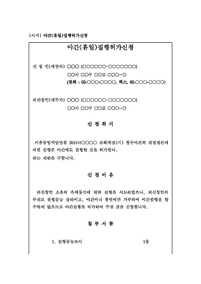 주요내용 : 채무자가 직장 등의 사유로 주간에 강제집행이 어렵거나 공휴일에만 집행이 가능한 경우, 민사집행법 제8조에 따라 법원으로부터 야간이나 휴일에도 강제집행을 할 수 있도록 허가를 요청하기 위한 목적으로 사용되어지는 신청서 양식임. 단 무단전재 방지 목적으로 PDF 파일로 올리니, 구매하신 후 혹 원본 파일이 필요하신 분들은 톡이나 문자, 메일, 전화 등을 주시면 작성 방법 등에 대한 간단한 무료 상담과 함께 원본 파일을 보내드리도록 하겠습니다.