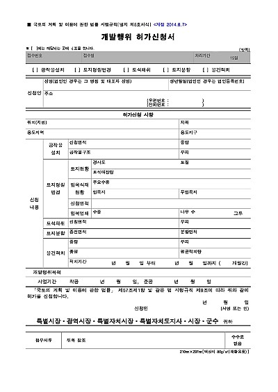 주요내용 : 토지의 이용을 변경하는 건축물 건축, 공작물 설치, 토지 형질변경, 토석 채취, 토지 분할, 물건 적치 등의 개발 행위를 하기 전, 관할 지자체에 허가를 받기 위해 제출하는 공식 문서임. 단 무단전재 방지목적으로 PDF 파일로 올리니, 구매하신 후 혹 원본 파일이 필요하신 분들은 톡이나 문자, 메일, 전화 등을 주시면 작성방법 등에 대한 간단한 무료상담과 함께 원본 파일을 보내드리도록 하겠습니다.