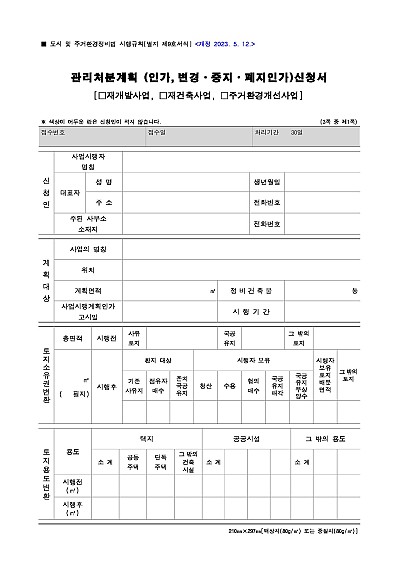 주요내용 : 재개발 재건축 사업에서 기존 토지 건물 소유자의 권리를 새로운 아파트 등 건축물 및 토지에 대한 바꾸어 배분하는 내용을 담은 관리처분계획안을 시장 군수 등에게 제출하여 법적 효력을 받기위한 목적으로 사용되어지는 신청서 양식임. 단 무단전재 방지목적으로 PDF 파일로 올리니, 구매하신 후 혹 원본 파일이 필요하신 분들은 톡이나 문자, 메일, 전화 등을 주시면 작성방법 등에 대한 간단한 무료상담과 함께 원본 파일을 보내드리도록 하겠습니다.