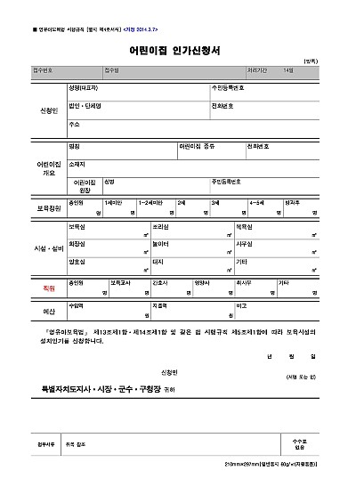 주요내용 : 새로운 어린이집을 설치하고 운영하기 위해 관할 지자체에 제출하는 서류로, 어린이집의 기본 정보(명칭, 소재지, 보육정원 등)와 운영자의 자격, 재정 능력, 시설 구비 서류 등을 포함하여 법적 기준에 부적합하지 않음을 증명하는 신청 양식임. 단 무단전재 방지목적으로 PDF 파일로 올리니, 구매하신 후 혹 원본 파일이 필요하신 분들은 톡이나 문자, 메일, 전화 등을 주시면 작성방법 등에 대한 간단한 무료상담과 함께 원본 파일을 보내드리도록 하겠습니다.