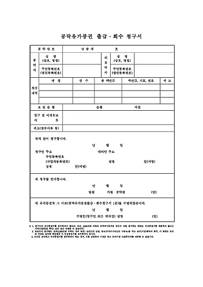주요내용 : 법원 등에 공탁된 유가증권(어음, 수표, 채권 등)을 찾아가거나(출급) 되돌려 받을 때(회수) 공탁관에게 제출하는 청구서 양식임. 단 무단전재 방지목적으로 PDF 파일로 올리니, 구매하신 후 혹 원본 파일이 필요하신 분들은 톡이나 문자, 메일, 전화 등을 주시면 작성방법 등에 대한 간단한 무료상담과 함께 원본 파일을 보내드리도록 하겠습니다.