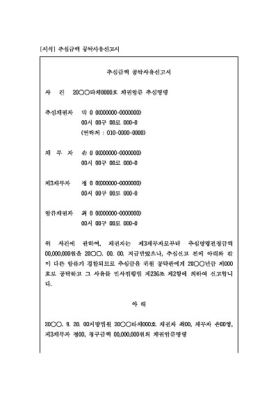 주요내용 채권자가 압류 및 추심명령을 받아 채무자의 제3채무자로부터 채권을 추심했을 때, 다른 압류, 가압류, 또는 배당요구가 경합하여 추심한 금액을 법원에 공탁(맡기는 행위)하고 그 사실을 신고하는 문서로서, 이는 민사집행법상 의무 사항으로, 혼자 추심금을 독차지하지 않고 다른 채권자들과 공평하게 배당받기 위한 절차로, 집행법원에 공탁 사실을 알려 배당 절차에 넘기는 역할을 한다단 무단전재 방지목적으로 PDF 파일로 올리니구매하신 후 혹 원본 파일이 필요하신 분들은 톡이나 문자메일전화 등을 주시면 작성방법 등에 대한 간단한 무료상담과 함께 원본 파일을 보내드리도록 하겠습니다.