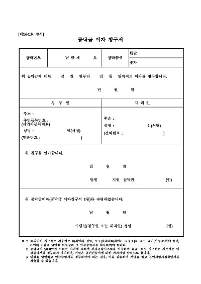 주요내용 공탁된 돈(공탁금)을 찾아갈 때, 원금과 함께 발생한 이자까지 함께 받기 위해 법원 공탁관에게 제출하는 문서로, 보통 공탁금 출급·회수청구서에 이자 지급 요청 내용을 포함하여 함께 제출하며, 이자를 별도로 청구할 때 쓰는 양식임단 무단전재 방지목적으로 PDF 파일로 올리니구매하신 후 혹 원본 파일이 필요하신 분들은 톡이나 문자메일전화 등을 주시면 작성방법 등에 대한 간단한 무료상담과 함께 원본 파일을 보내드리도록 하겠습니다.