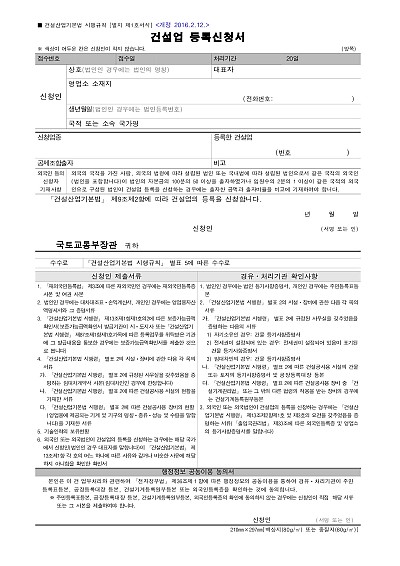 주요내용 : 건설산업기본법에 따라 건설업을 하려는 사업자가 자본금, 기술인력, 사무실, 장비 등 법정 등록기준을 갖추었음을 증명하고 건설업 면허를 받기 위해 제출하는 공식 문서임. 단 무단전재 방지목적으로 PDF 파일로 올리니, 구매하신 후 혹 원본 파일이 필요하신 분들은 톡이나 문자, 메일, 전화 등을 주시면 작성방법 등에 대한 간단한 무료상담과 함께 원본 파일을 보내드리도록 하겠습니다.