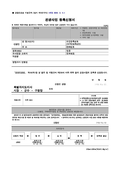 주요내용 : 여행업, 관광숙박업, 관광객 이용시설업(카지노, 관광단지 등) 등 관광 관련 사업을 시작하기 위해 관할 지자체(시·군·구청 문화관광과 등)에 제출하는 공식 문서 양식임. 단 무단전재 방지목적으로 PDF 파일로 올리니, 구매하신 후 혹 원본 파일이 필요하신 분들은 톡이나 문자, 메일, 전화 등을 주시면 작성방법 등에 대한 간단한 무료상담과 함께 원본 파일을 보내드리도록 하겠습니다.