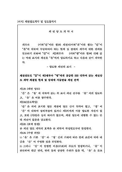 주요내용 : 채권양도계약서란 기존 채권자(양도인)가 자신의 채권을 다른 사람(양수인)에게 넘겼다는 사실을 채무자에게 공식적으로 알리는 문서로, 채무자는 이제 새로운 채권자(양수인)에게 돈을 갚아야 함을 명확히 하는 법적 절차입니다. 이 통지가 채무자에게 도달해야만 채권 양도의 효력이 발생하며, 이는 주로 내용증명 우편으로 발송되어 채권 양도 사실을 증명하고, 이중 양도 등으로부터 채무자를 보호하는 중요한 역할을 한다.