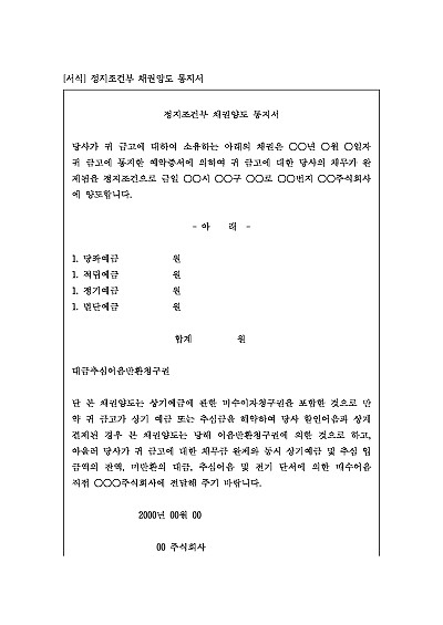 주요내용 : 채권이 특정 조건이 성취되어야만 완전히 양수인의 권리로 넘어가는 상황에서, 채무자에게 양도 사실과 효력 발생 시점(조건 성취 시)을 알리는 문서 양식임. 단 무단전재 방지목적으로 PDF 파일로 올리니, 구매하신 후 혹 원본 파일이 필요하신 분들은 톡이나 문자, 메일, 전화 등을 주시면 작성방법 등에 대한 간단한 무료상담과 함께 원본 파일을 보내드리도록 하겠습니다.