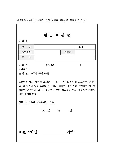 주요내용 : 현금보관증은 상대방의 현금을 자신이 보관하고 있다는 것을 증명하기 위해 교부하는 문서 양식임. 단 무단전재 방지목적으로 PDF 파일로 올리니, 구매하신 후 혹 원본 파일이 필요하신 분들은 톡이나 문자, 메일, 전화 등을 주시면 작성방법 등에 대한 간단한 무료상담과 함께 원본 파일을 보내드리도록 하겠습니다.