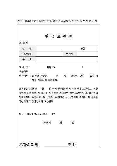 주요내용: 현금보관증은 금전이나 물품을 빌릴 때 채권자와 채무자 사이에서 작성되는 채권채무관계의 법적 근거가 되는 문서로서, 차용금 액수, 이자, 변제기 및 방법 등을 구체적으로 기재하여야 되며, 관련 분쟁발생시 중요한 증거로서의 역할을 하는 문서임.단 무단전재 방지목적으로PDF파일로 올리니,구매하신 후 혹 원본 파일이 필요하신 분들은 톡이나 문자,메일,전화 등을 주시면 작성방법 등에 대한 간단한 무료상담과 함께 원본 파일을 보내드리도록 하겠습니다.