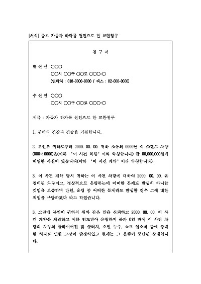 주요내용 : 민법상의 매도인의 하자담보책임에 근거한 법적 구제수단이며, 이는 구매한 중고차에 숨겨진 결함이 있을 경우 판매자에게 그 책임을 물어 계약해제 또는 수리비 상당의 손해배상을 요구할 때 사용되어지는 양식임. 단 무단전재 방지목적으로 PDF 파일로 올리니, 구매하신 후 혹 원본 파일이 필요하신 분들은 톡이나 문자, 메일, 전화 등을 주시면 작성방법 등에 대한 간단한 무료상담과 함께 원본 파일을 보내드리도록 하겠습니다.