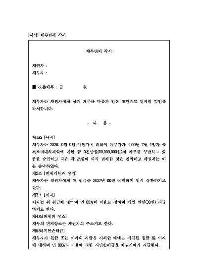 주요내용 : 채무자가 채권자에게 특정 금액의 채무를 특정 조건에 맞추어 변제하겠다는 내용을 문서로 약속할 목적으로 사용되어지는 양식임. 단 무단전재 방지목적으로 PDF 파일로 올리니, 구매하신 후 혹 원본 파일이 필요하신 분들은 톡이나 문자, 메일, 전화 등을 주시면 작성방법 등에 대한 간단한 무료상담과 함께 원본 파일을 보내드리도록 하겠습니다.