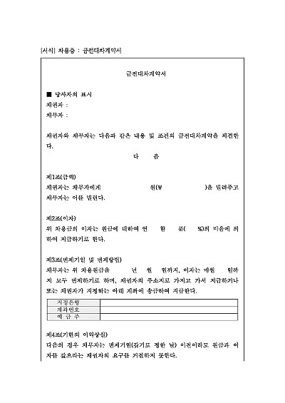 주요내용 돈을 빌려주고 빌리는 관계(채권·채무)에서, 빌려주는 사실과 상환 조건 등을 증명하기 위해 작성하는 문서 양식임. 단 무단전재 방지목적으로 PDF 파일로 올리니구매하신 후 혹 원본 파일이 필요하신 분들은 톡이나 문자메일전화 등을 주시면 작성방법 등에 대한 간단한 무료상담과 함께 원본 파일을 보내드리도록 하겠습니다.
