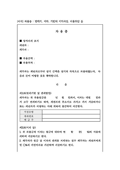주요내용 돈을 빌려주고 빌리는 관계(채권·채무)에서, 빌려주는 사실과 상환 조건 등을 증명하기 위해 작성하는 문서 양식임. 단 무단전재 방지목적으로 PDF 파일로 올리니구매하신 후 혹 원본 파일이 필요하신 분들은 톡이나 문자메일전화 등을 주시면 작성방법 등에 대한 간단한 무료상담과 함께 원본 파일을 보내드리도록 하겠습니다.