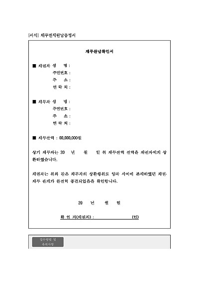 주요내용 : 채무자가 채권자에게 빚을 모두 갚아 채권·채무 관계가 완전히 종료되었음을 증명하는 공식 문서 양식임. 단 무단전재 방지목적으로 PDF 파일로 올리니, 구매하신 후 혹 원본 파일이 필요하신 분들은 톡이나 문자, 메일, 전화 등을 주시면 작성방법 등에 대한 간단한 무료상담과 함께 원본 파일을 보내드리도록 하겠습니다.
