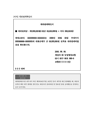 주요내용 채무자가 아닌 제3자(보증기관, 보증인 등)가 채무 대신 변제했을 때, 채권자로부터 해당 채무 변제를 증명받고 채권자의 권리(채권 및 담보권 등)를 승계했음을 증명하는 문서 양식임단 무단전재 방지목적으로 PDF 파일로 올리니구매하신 후 혹 원본 파일이 필요하신 분들은 톡이나 문자메일전화 등을 주시면 작성방법 등에 대한 간단한 무료상담과 함께 원본 파일을 보내드리도록 하겠습니다.