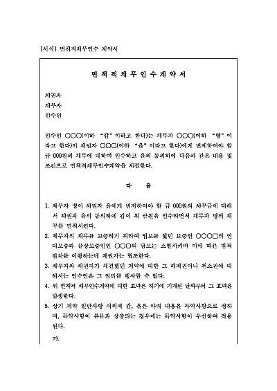 주요내용 : 기존 채무자가 채무 관계에서 완전히 벗어나고(면책), 제3자인 인수인에게 동일한 채무가 이전되는 것을 목적으로 하는 계약서 양식임. 단 무단전재 방지 목적으로 PDF 파일로 올리니, 구매하신 후 혹 원본 파일이 필요하신 분들은 톡이나 문자, 메일, 전화 등을 주시면 작성 방법 등에 대한 간단한 무료 상담과 함께 원본 파일을 보내드리도록 하겠습니다.