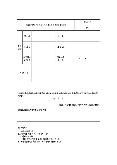 주요내용 : 공익법인 등이 법인의 재정적 기반이 되는 기본재산을 매도, 증여, 임대, 교환, 담보 제공하거나 용도를 변경할 때, 주무관청의 허가를 받기 위해 제출하는 신청서류 양식임. 단 무단전재 방지 목적으로 PDF 파일로 올리니, 구매하신 후 혹 원본 파일이 필요하신 분들은 톡이나 문자, 메일, 전화 등을 주시면 작성 방법 등에 대한 간단한 무료 상담과 함께 원본 파일을 보내드리도록 하겠습니다.