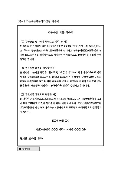 주요내용 : 비영리법인 등이 법인의 존립 기초가 되는기본재산을 매도, 증여, 교환, 임대, 담보제공 등을 하려고 할 때, 주무관청의 허가를 받기 위해 제출하는 문서 양식임. 단 무단전재 방지 목적으로 PDF 파일로 올리니, 구매하신 후 혹 원본 파일이 필요하신 분들은 톡이나 문자, 메일, 전화 등을 주시면 작성 방법 등에 대한 간단한 무료 상담과 함께 원본 파일을 보내드리도록 하겠습니다.