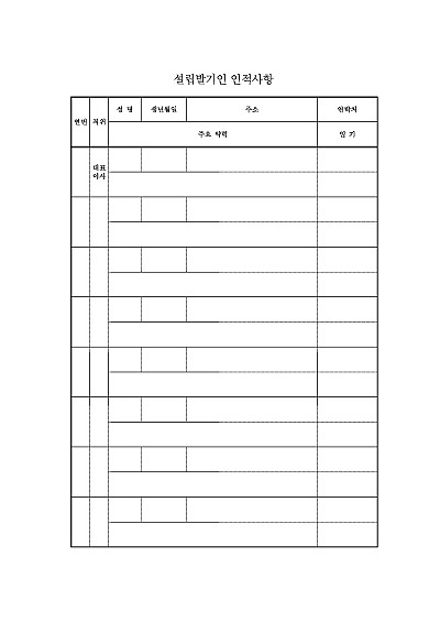 주요내용 : 사단법인설립 시 발기인의 정인정보를 기재하는 서식임. 단 무단전재 방지목적으로 PDF 파일로 올리니구매하신 후 혹 원본 파일이 필요하신 분들은 톡이나 문자메일전화 등을 주시면 작성방법 등에 대한 간단한 무료상담과 함께 원본 파일을 보내드리도록 하겠습니다.