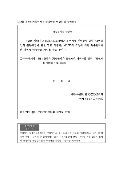 주요내용 : 개인이 특정 공익법인의출연자 등과 특수관계에 있는 자임을 확인하는 문서 양식임. 단 무단전재 방지목적으로 PDF 파일로 올리니, 구매하신 후 혹 원본 파일이 필요하신 분들은 톡이나 문자, 메일, 전화 등을 주시면 작성방법 등에 대한 간단한 무료상담과 함께 원본 파일을 보내드리도록 하겠습니다.